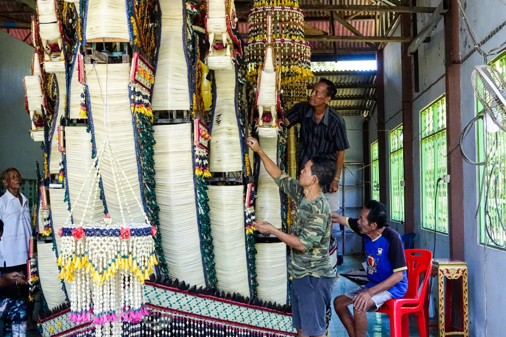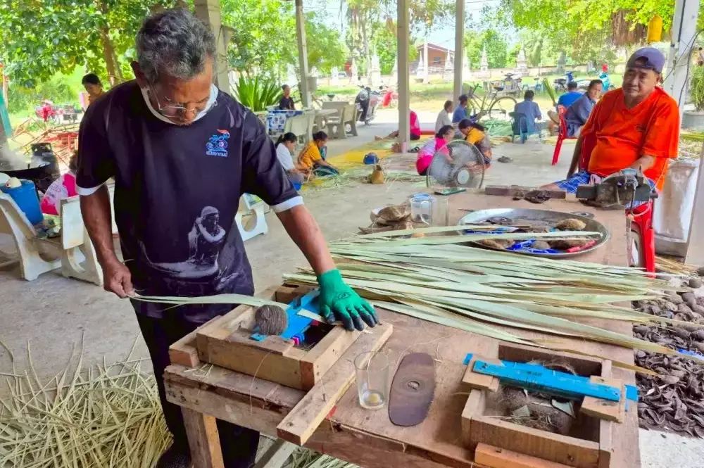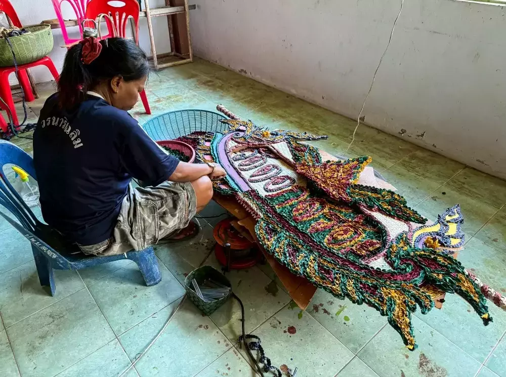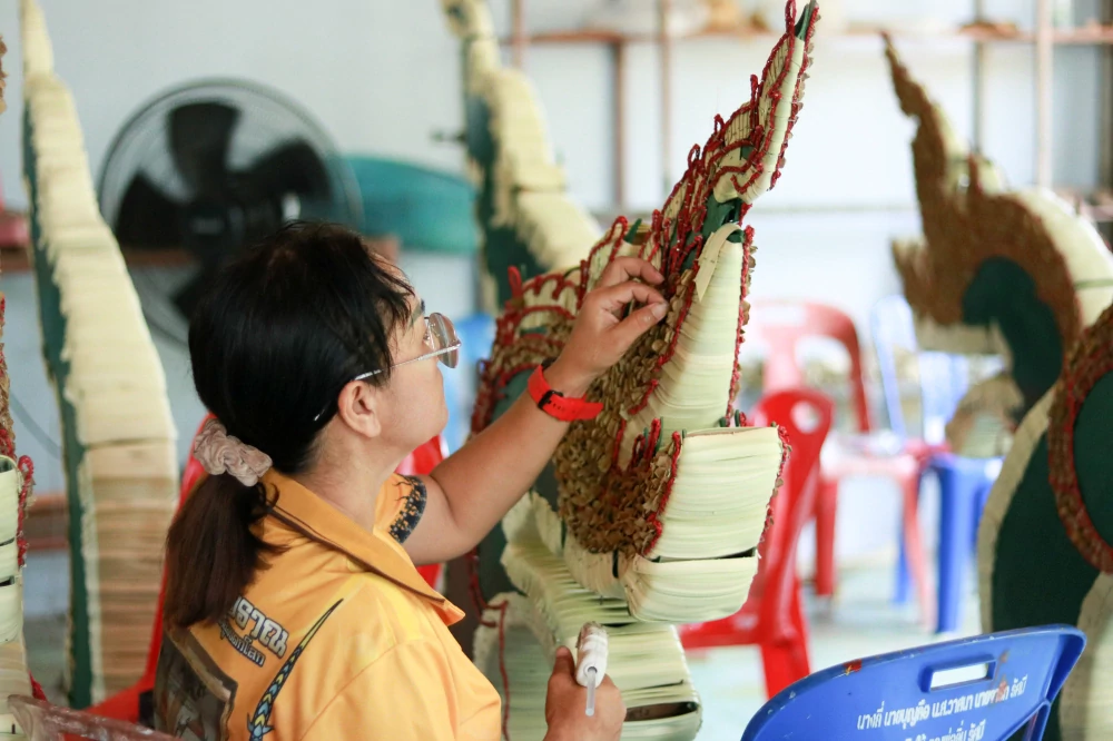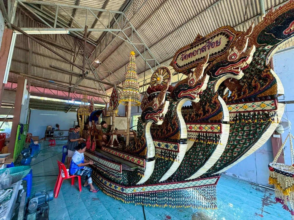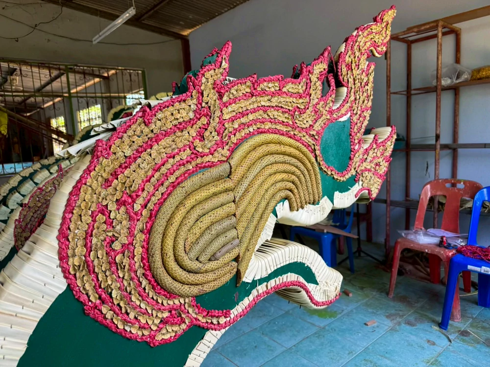 ความงามยังอยู่ที่ภูมิปัญญาท้องถิ่น วัดดอกสร้อยเลือกใช้วัสดุจากสิ่งรอบตัวอย่างคุ้มค่า ตั้งแต่ใบตาล ก้านตาล ลูกตาล ไปจนถึงงวงตาล งวงตาลที่เคยใช้ทำน้ำตาล ถูกนำมาผ่าทำเป็นเกล็ดพญานาคระยิบระยับบนลำเรือ ส่วนเศษก้านตาลเล็ก ๆ ที่ชาวบ้านช่วยกันเตรียมยามว่าง ก็กลายเป็นชิ้นงานประณีตที่เปี่ยมด้วยชีวิต เพราะสำหรับชาวบ้านวัดดอกสร้อย…การทำเรือพระไม่ใช่แค่การเตรียมขบวนแห่ แต่มันคือการรวมใจให้เต้นไปพร้อมกันในจังหวะแห่งศรัทธาและความงามของถิ่นฐาน