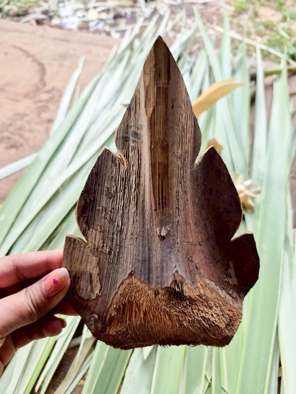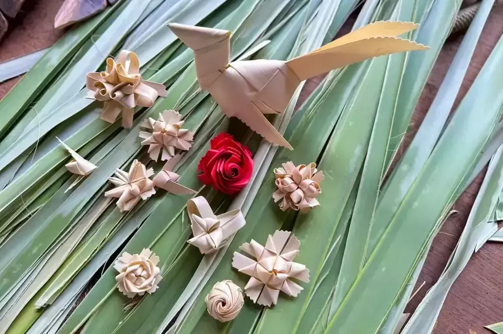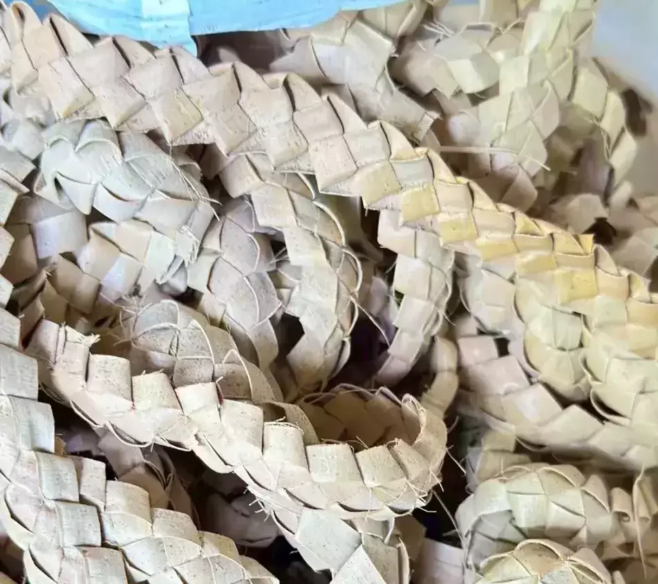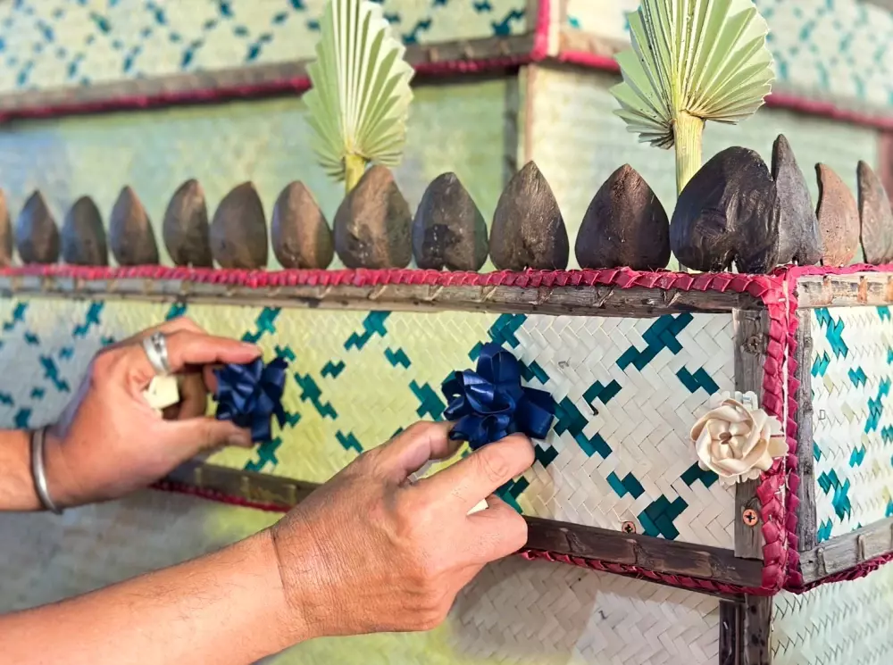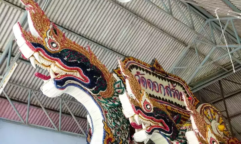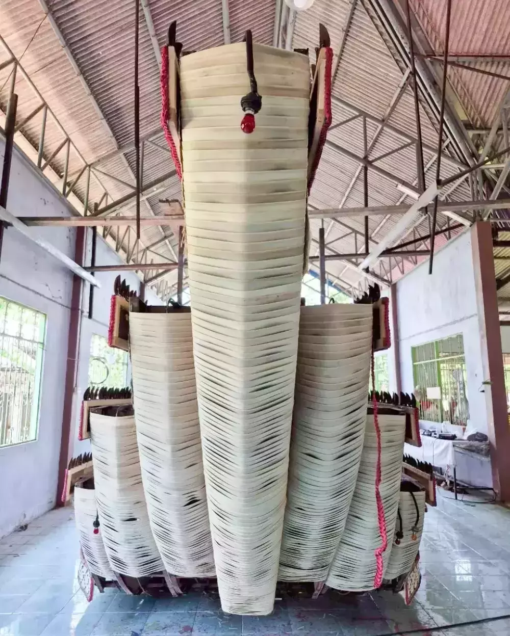ความงามยังอยู่ที่ภูมิปัญญาท้องถิ่น วัดดอกสร้อยเลือกใช้วัสดุจากสิ่งรอบตัวอย่างคุ้มค่า ตั้งแต่ใบตาล ก้านตาล ลูกตาล ไปจนถึงงวงตาล งวงตาลที่เคยใช้ทำน้ำตาล ถูกนำมาผ่าทำเป็นเกล็ดพญานาคระยิบระยับบนลำเรือ ส่วนเศษก้านตาลเล็ก ๆ ที่ชาวบ้านช่วยกันเตรียมยามว่าง ก็กลายเป็นชิ้นงานประณีตที่เปี่ยมด้วยชีวิต เพราะสำหรับชาวบ้านวัดดอกสร้อย…การทำเรือพระไม่ใช่แค่การเตรียมขบวนแห่ แต่มันคือการรวมใจให้เต้นไปพร้อมกันในจังหวะแห่งศรัทธาและความงามของถิ่นฐาน