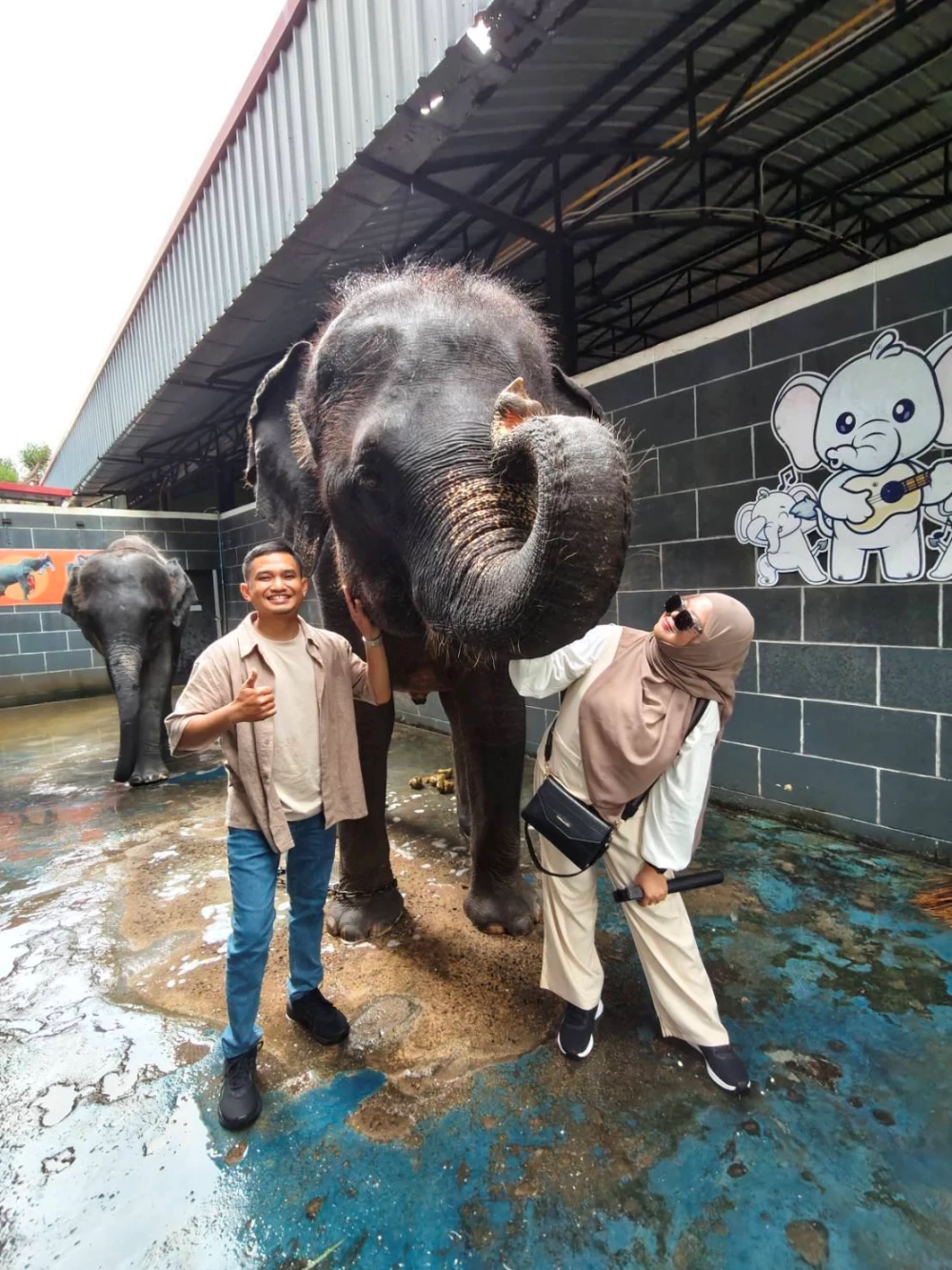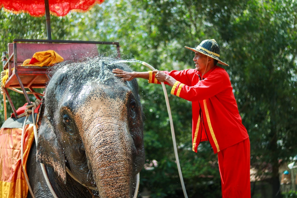 หลังจากพวกเขาอิ่มท้องจากมื้อเช้า ก็ถึงเวลาของกิจกรรมที่ชวนให้ผู้พบเห็นต้องอมยิ้มตาม... นั่นคือการอาบน้ำขัดตัวให้กับ "สุภาพสตรีตัวโต" ทั้ง 16 เชือกนี้ ท่ามกลางแสงแดดอ่อน ๆ ในยามเช้า ซึ่งต้องอาศัยความละเมียดละไมเป็นพิเศษ ตั้งแต่การอาบน้ำขัดถูผิวหนังที่หยาบหนาแต่ต้องการความอ่อนโยน ไปจนถึงการสังเกตแววตาเพื่ออ่านความรู้สึกของพวกเขา