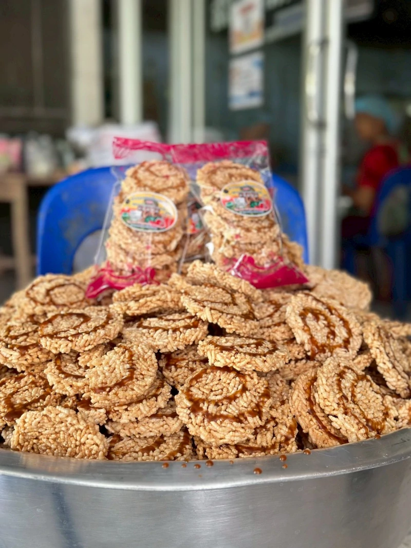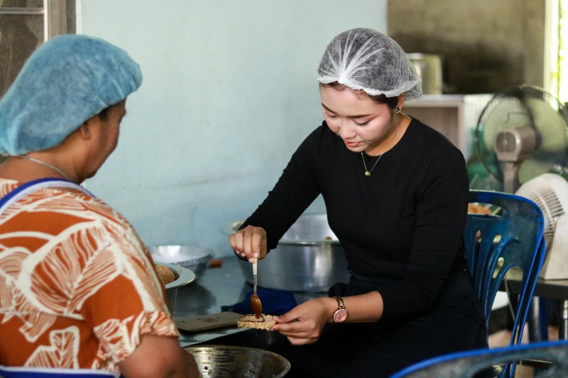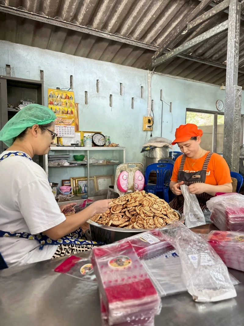 การทำข้าวแต๋นของที่นี่ ไม่ได้เป็นแค่กระบวนการผลิต แต่มันคือ “กิจกรรมของชุมชน” ตั้งแต่การแช่ข้าวเหนียวในน้ำแตงโมนานกว่า 6 ชั่วโมง การนึ่ง คลุกเคล้า ไปจนถึงการขึ้นรูป ทุกขั้นตอนเต็มไปด้วยบทสนทนา เรื่องลูก เรื่องบ้าน เรื่องชีวิต จากพื้นที่ที่เคยเงียบ กลายเป็นพื้นที่ที่มีเสียงหัวเราะแทบทั้งวัน