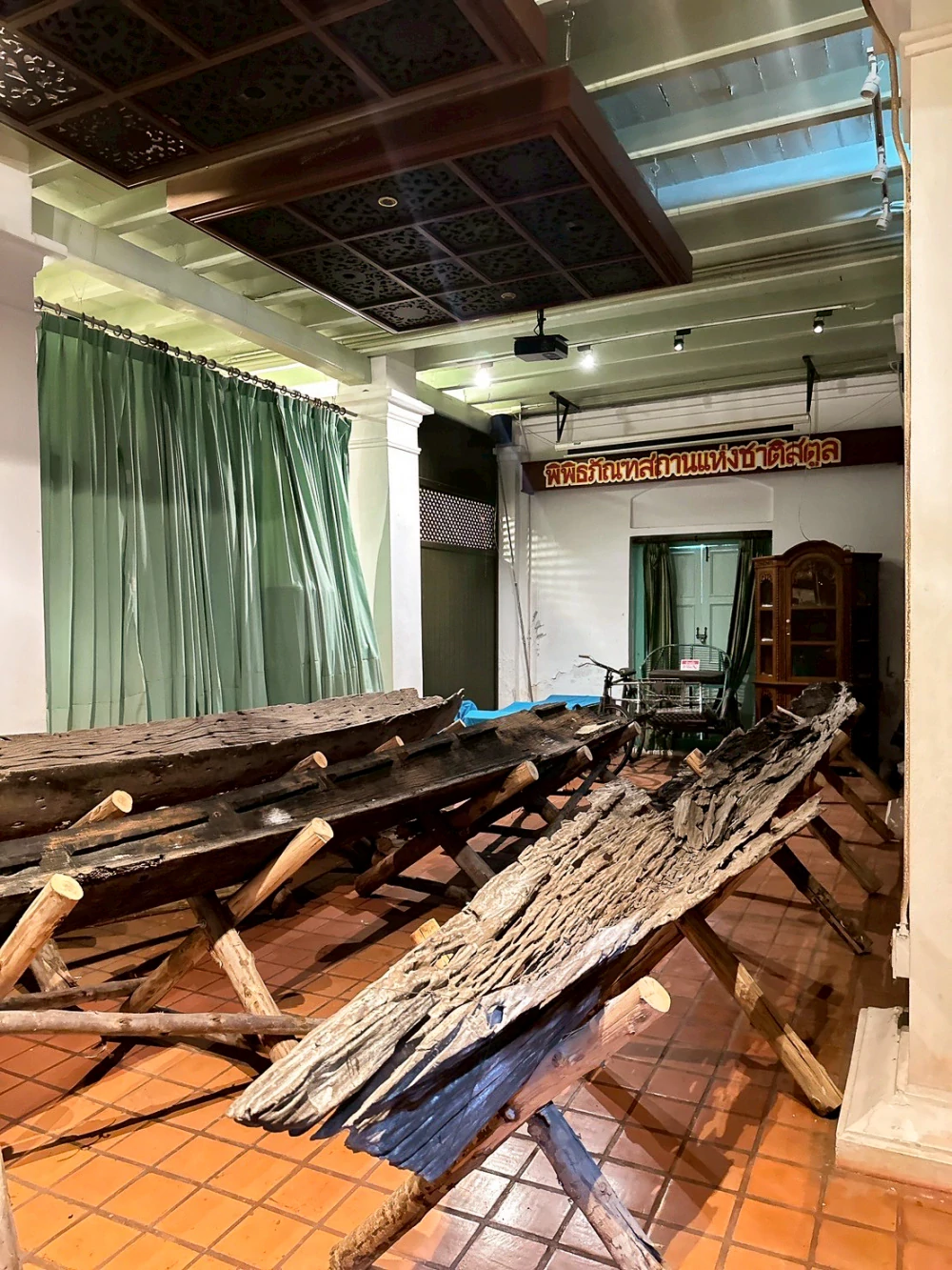 - ประติมากรรมจากไม้ซุงท่อนเดียว (เรือโบราณ): ในห้องนิทรรศการเรือ ร่างของเรือไม้ 3 ลำที่ขุดจากไม้ทั้งต้นนอนสงบนิ่ง รอคอยให้เราไปสัมผัส ทุกรอยสิ่วคือบทบันทึกการต่อสู้กับเกลียวคลื่น คาดว่ามีอายุไม่ต่ำกว่า 400 ปี นี่คืองานประติมากรรมที่ครั้งหนึ่งเคยมีชีวิตโลดแล่นอยู่กลางทะเลอันดามัน