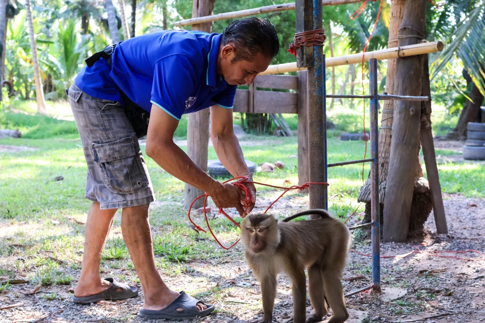 - ฝึกลงสนามจริง: เมื่อลิงเริ่มมีความพร้อม จึงค่อยพาไปฝึกกับต้นมะพร้าวจริง โดยมีผู้ดูแลคอยสังเกตและให้กำลังใจอยู่ใกล้ ๆ